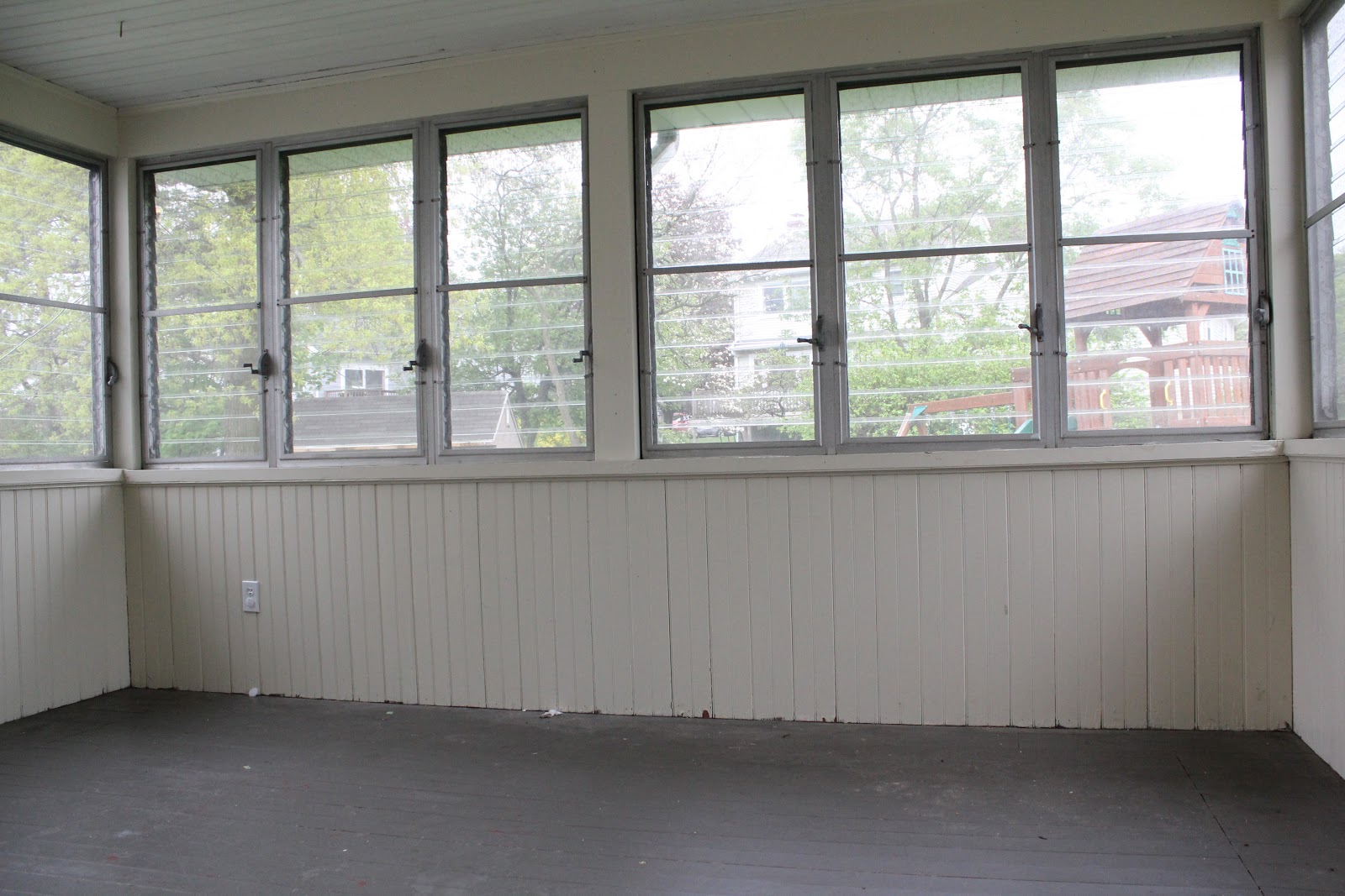 Before I began work on the porch I took the all important “before” shots. It is a typical three season porch that can be found on countless homes, especially here in New England. The floors are just painted wooden plank floors with no foundation. The walls are wood bead board and the one wall against the house is the original exterior wood siding. The walls are all painted the same color as the exterior of our home, that oh so lovely and nauseating shade of yellow. The floors are painted in the equally appealing shade of brown green that my front shutters used to be.