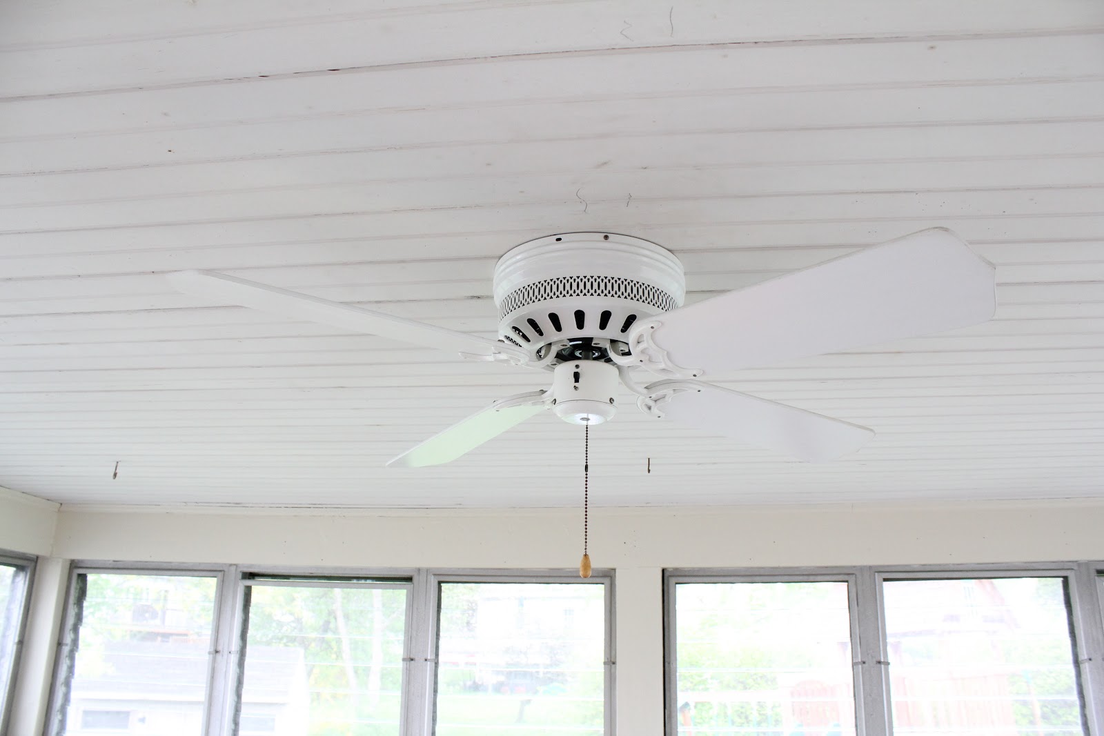 The ceiling is wooden breadboard that is crying out for a good coat of paint. From what I can tell they were originally just stained wood. A quick coat of paint was added on top again in that not too appealing shade of mustard yellow. A white ceiling fan is in the middle of the room. It does not have a light on it and I was tempted to remove it except it is great for that extra breeze. It will stay, with some updates.