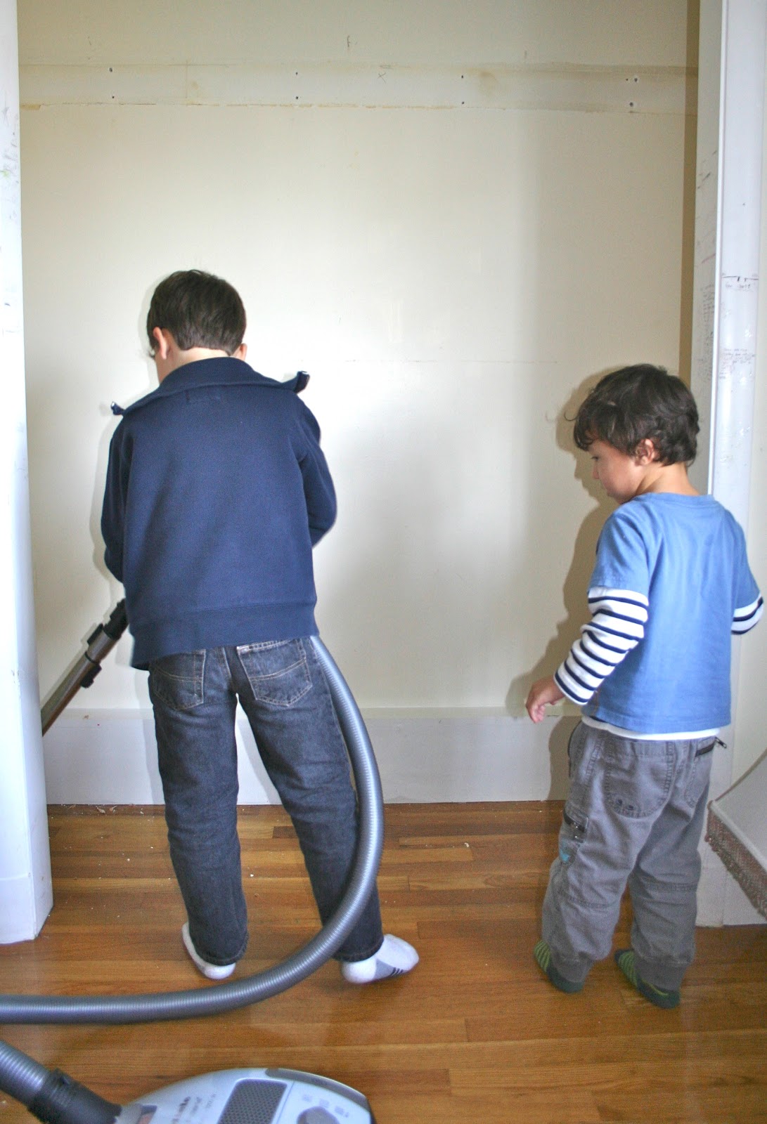 Once everything was removed and all the old nails and pieces of wood were safely brought to the garage my cleaning crew came in and finished up. They work for cheap. I paid them with milk, cookies and gummy bears.