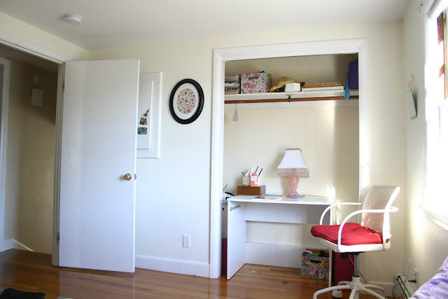 Work continues on my daughters bedroom and there has been some big changes to share. Painting the bedroom was not the biggest project I tackled in this room. I decided to gut her closet in order to create a desk area for her. From here on out it shall be referred to as the cloffice.